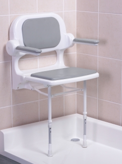 Le siège Hawaï Confort permet de prendre une douche confortablement installé avec des accoudoirs et un dossier rembourrés. L’ensemble se relève contre le mur pour laisser l’espace de la douche aux autres utilisateurs. L’assise amovible est rembourrée.